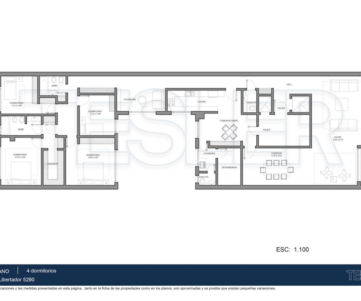 Departamento – Av. del Libertador y Zabala – Venta Piso frente a Av. del Libertador. Living y comedor. Playroom. 4 dormitorios. 1 en suite con vestidor. 2 baños completos. Toilette. Cocina con comedor diario. Lavadero y dependencia. Cochera. Vigilancia 24hs.