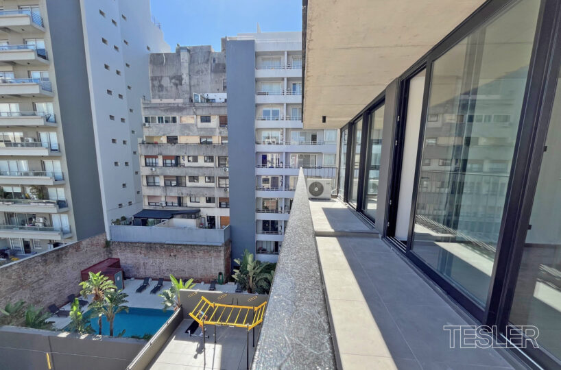 Amplio y luminoso monoambiente a estrenar. Living comedor. Cocina integrada. Baño completo. Balcón aterrazado. Apto profesional. Terraza con parrilla, solarium y sala de proyección.