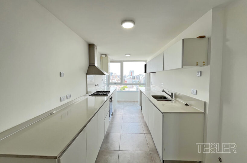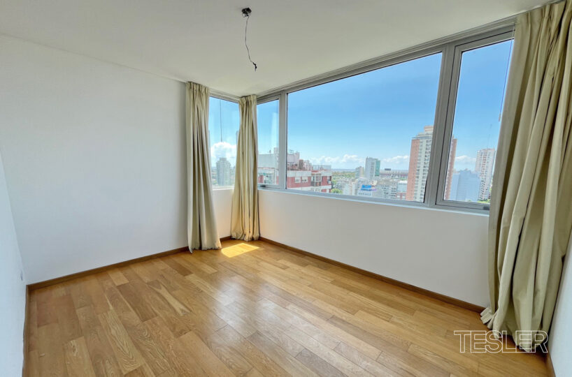 Living comedor. 3 dormitorios. 1 en suite con vestidor. 2 baños completos. Toilette. Cocina con office. Lavadero y dependencia. 2 cocheras fijas. Vigilancia 24hs. Pileta cubierta, pileta descubierta, salón de fiestas, gimnasio en piso 27°, juegos para niños, kids club, spa. Alquiler más gastos.