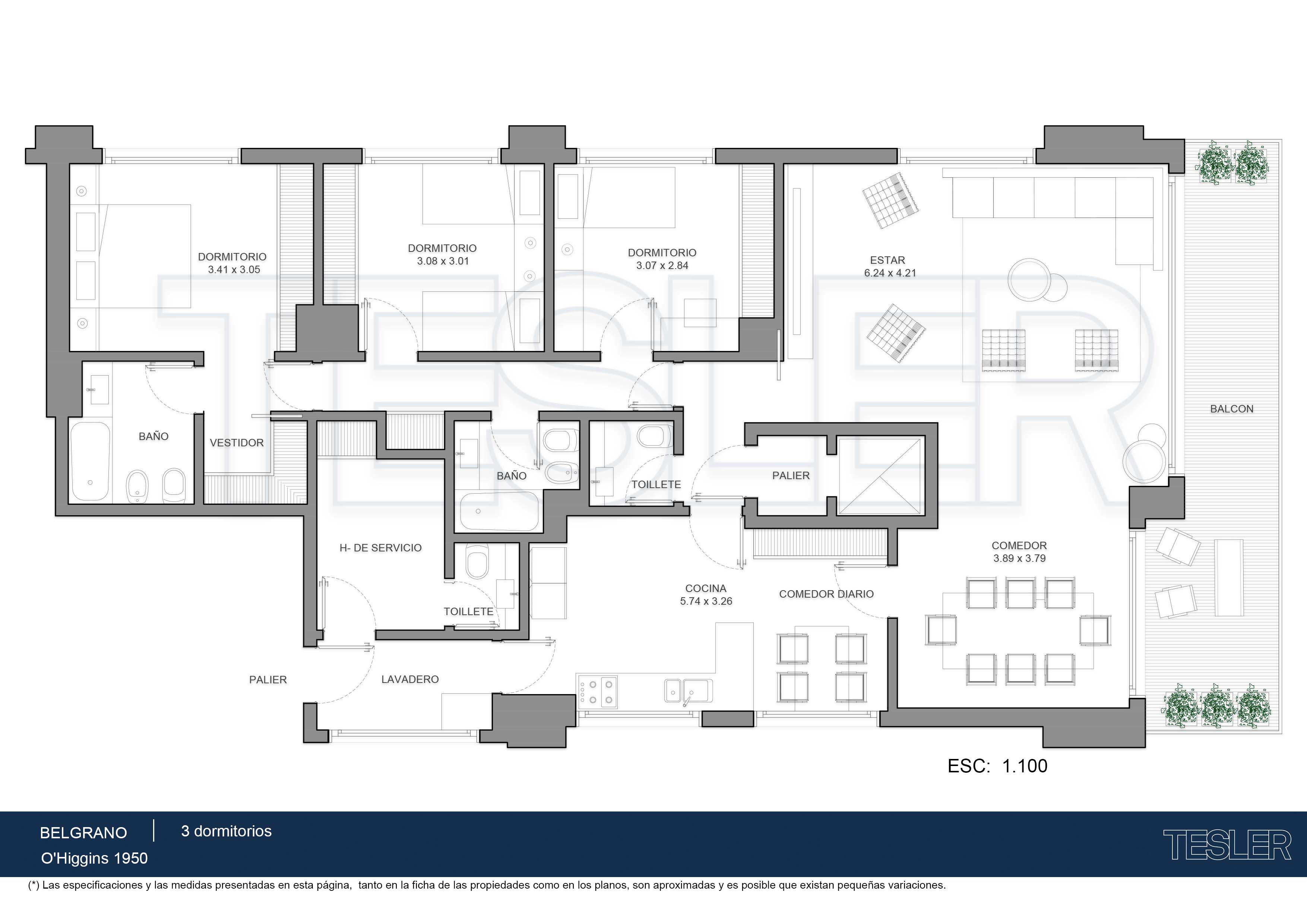 Semipiso en torre con palier privado y excelente luz. Living comedor. 3 dormitorios. 1 en suite con vestidor. 2 baños completos. Toilette. Cocina con comedor diario. Balcón aterrazado. Lavadero y dependencia. 2 cocheras fijas. Vigilancia 24hs. Pileta y parrilla.