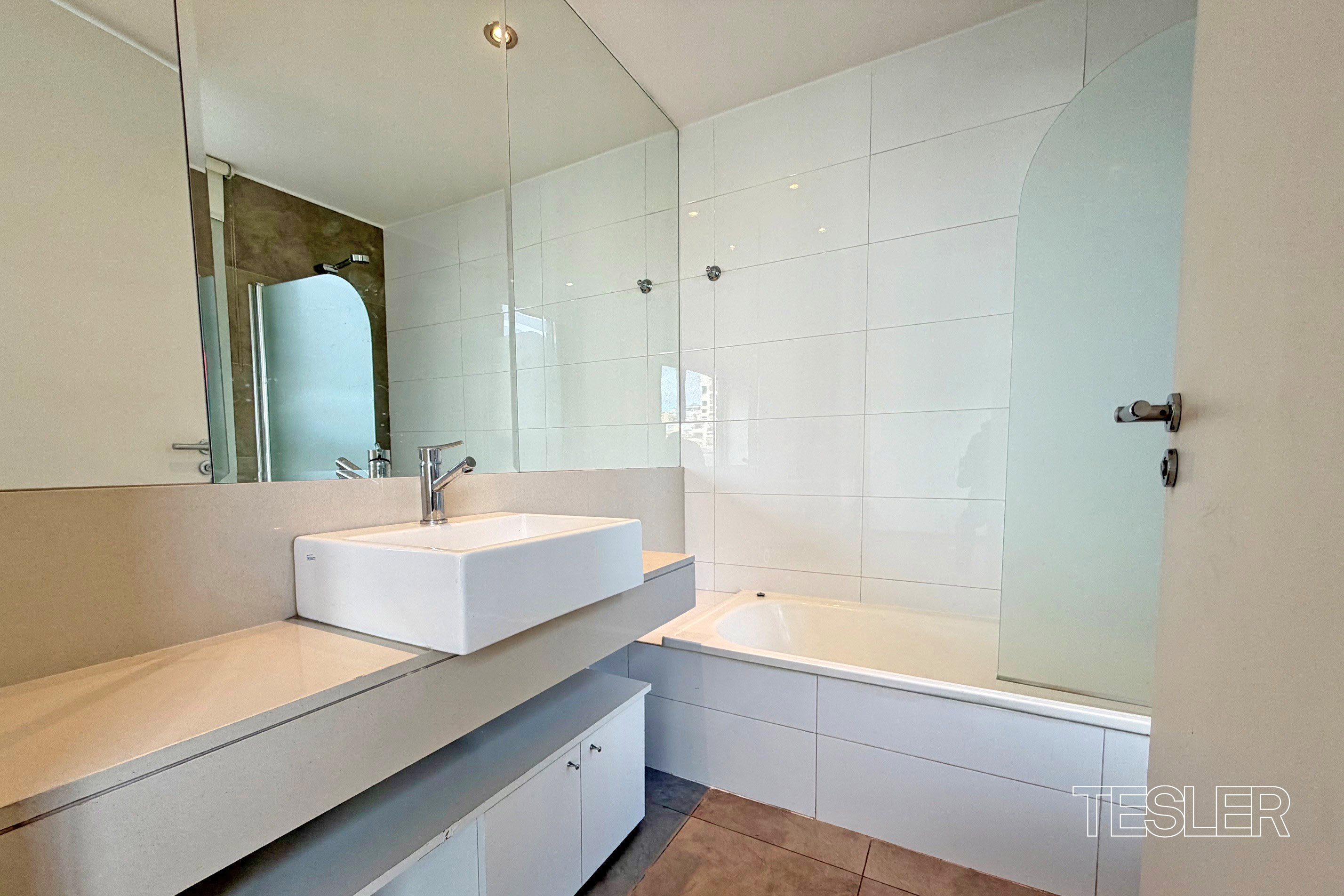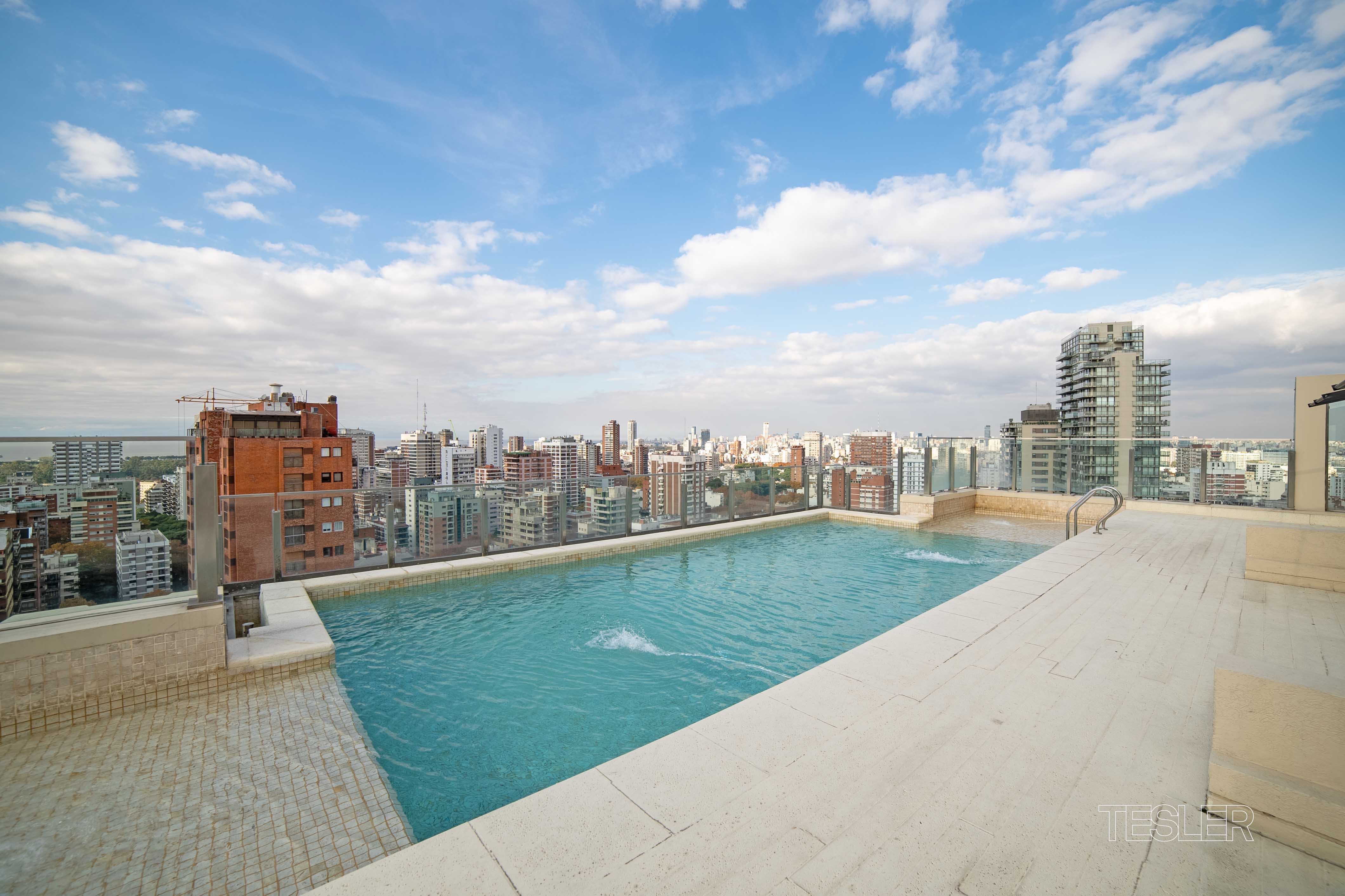 Piso alto con excelente luz. Living comedor. 2 dormitorios en suite. Principal con vestidor. Toilette. Amplia cocina con comedor diario. Balcón aterrazado. Lavadero y dependencia. Cochera fija. Vigilancia 24hs. 2 piletas, gimnasio, SUM, quincho con parrilla, spa y juegos para niños.